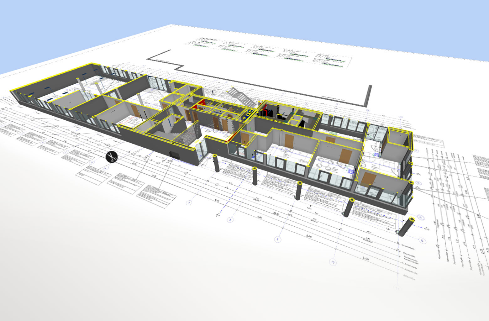 Die Planung erfolgt auf Grundlage eines 3D-Modelles mit intelligenten Bauteilen. 2D-Pläne, die zum Einsatz kommen, werden immer aus dem 3D-Modell abgeleitet. Dieses Modell ist die sogenannte Single Source of Truth. Alle Projektbeteiligte greifen so auf den gleichen konsistenten Datenbestand zurück. Widersprüche in 2D-Plänen zum Beispiel zwischen Ansicht und Grundriss können so nicht mehr auftreten.