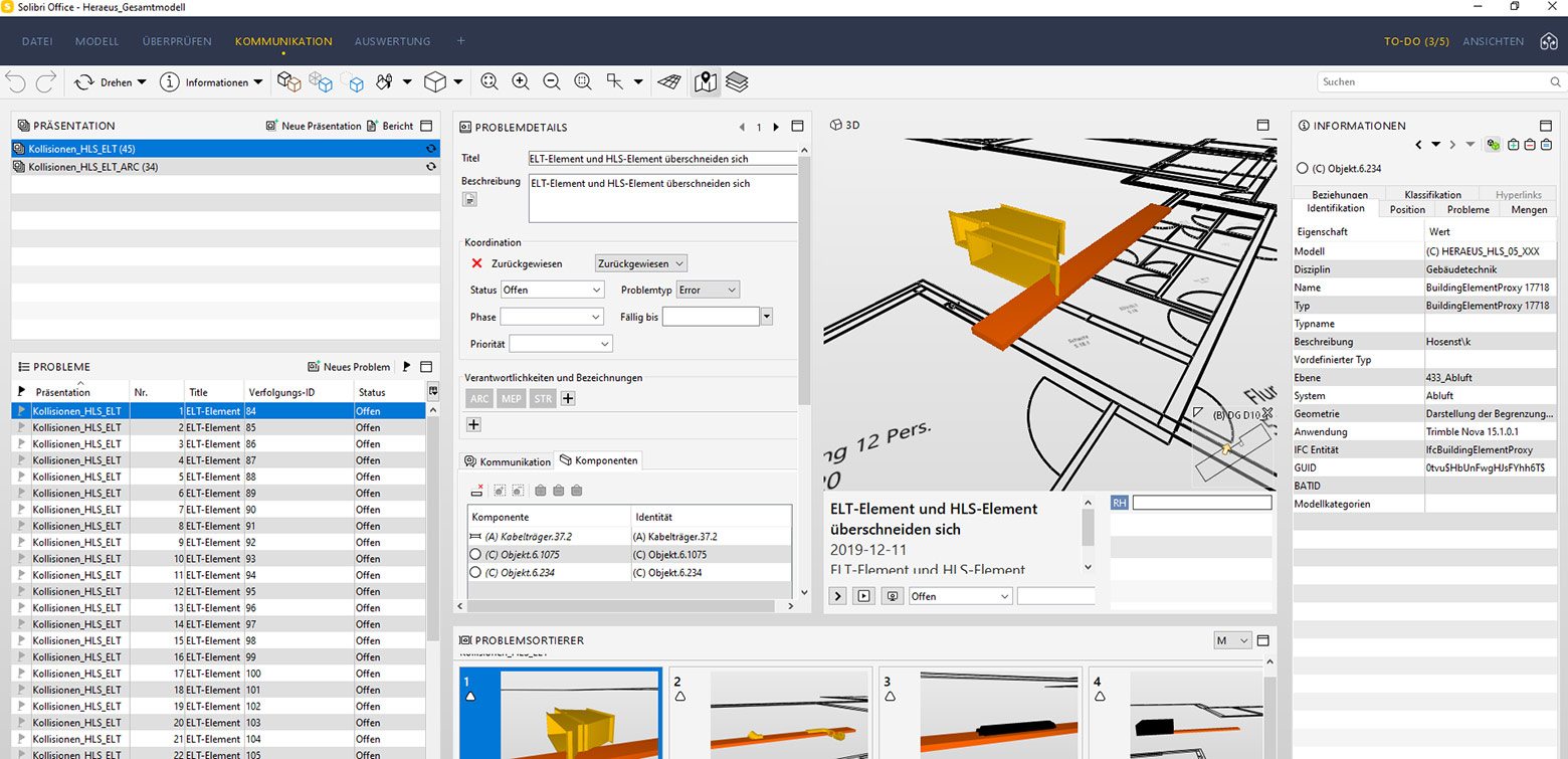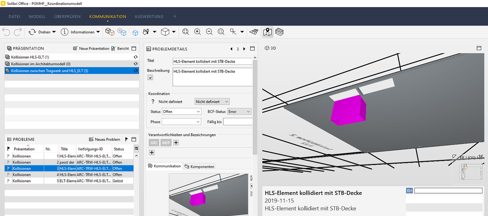 Grundlage für dieses Projekt waren zunächst die durchgeführten Maßnahmen der BIM-Koordination. In einem nächsten Schritt konnte eine Prüfungssoftware die Fachmodelle im IFC-Format übereinanderlegen und die Planung auf Kollisionen prüfen. Es fanden dazu regelmäßige Besprechungen statt, in denen Kollisionen besprochen wurden und die Planer Ihre Planung anpassen konnten. Die frühzeitige Kollisionskontrolle vermeidet Ausführungskollisionen auf der Baustelle und spart damit Zeit und Kosten auf der Baustelle.