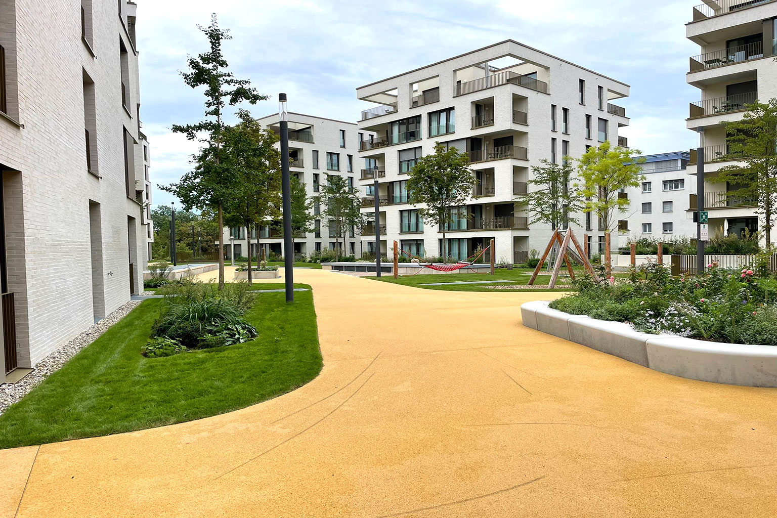 Belag abbrechen und mit sämtlichen Bauwerksfugen des Neuaufbaus und der Entwässerung wiederherstellen. Die Oberfläche wurde mit hellem Quarzit 2/5 mm bearbeitet