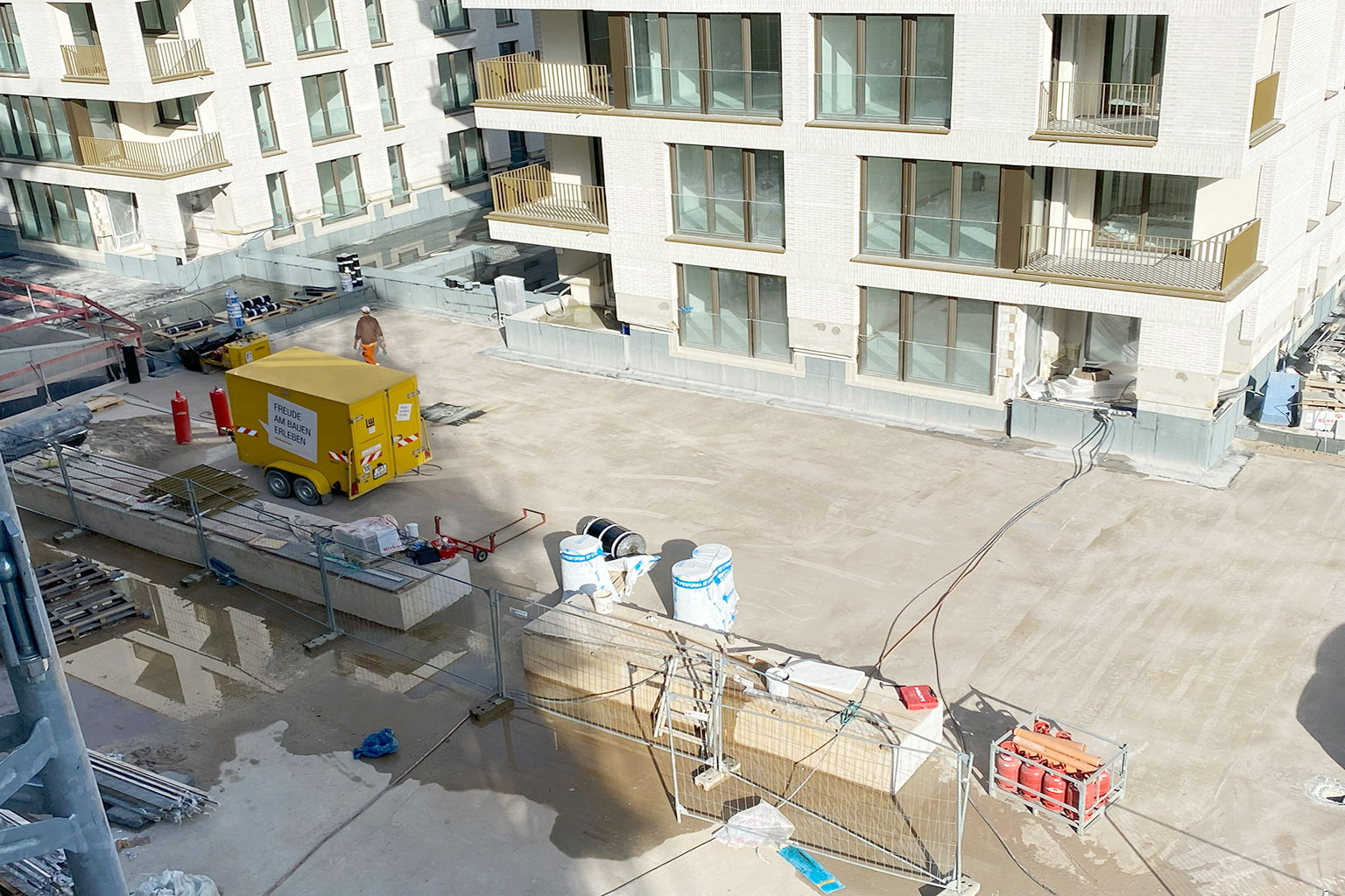 Ausführung sämtlicher Gussasphaltestricharbeiten einschließlich der Abdichtung und Wärmedämmung, teilweise mit integrierter Fußbodenheizung vom Keller bis zum 2. OG in mehreren Etappen, Gesamtflächen ca. 1.000 qm