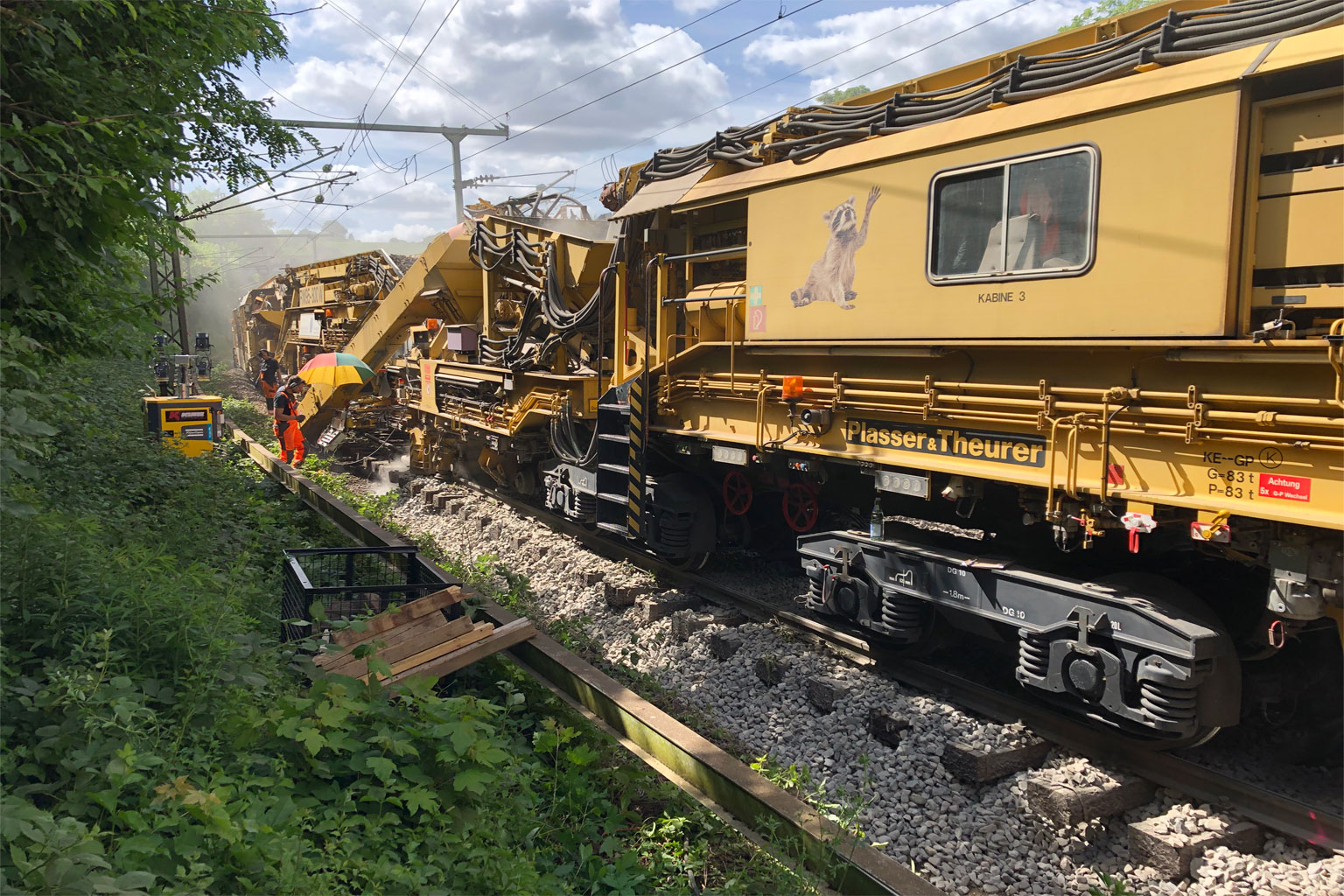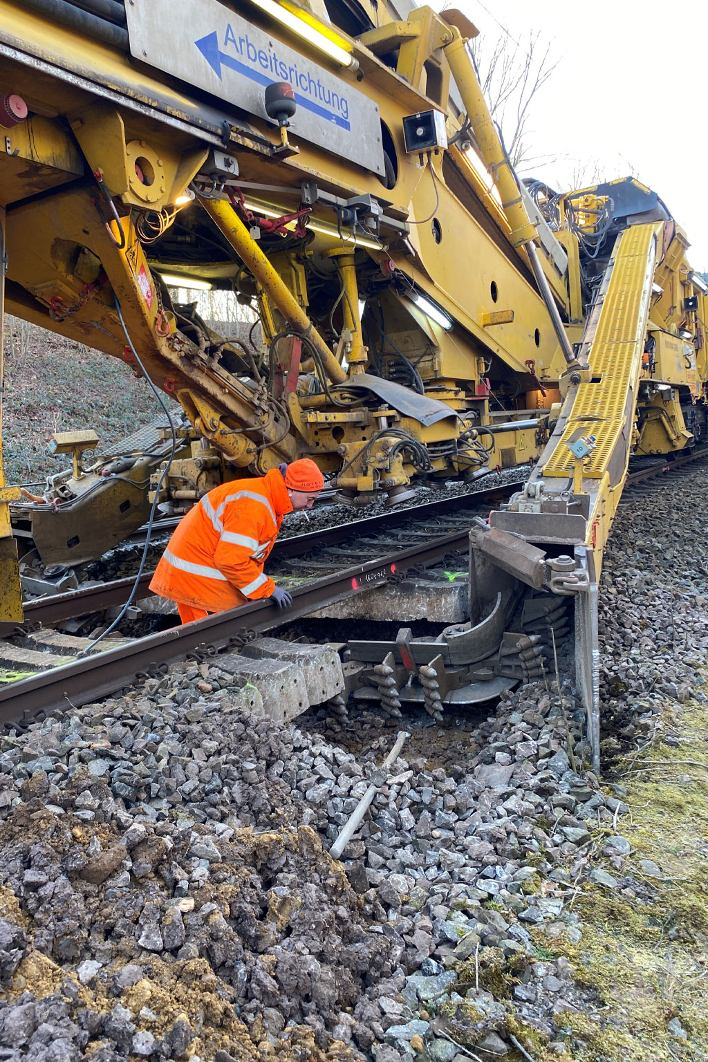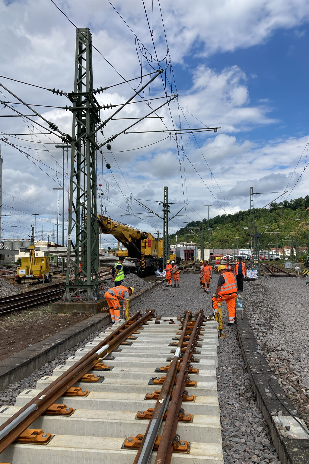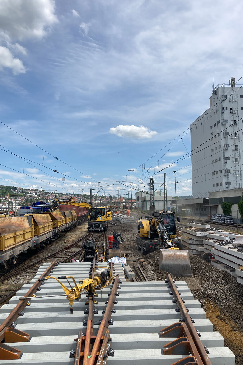 Erneuerung von fünf Weichen (2 Stk. EW 54-500 1:12, 2 Stk. IBW 54-500 1:12,1 Stk. IBW 54-500 1:14), gleichzeitig Erneuerung eines Durchlasses (DN 600) inklusive Kontrollschächten unterhalb von zwei Weichen. Ver- und Entsorgung per Bahnlogistik. Aufgrund der Streckensperrung Nürtingen-Wendlingen musste unsere gesamte Versorgung mit Neustoffen am Baubeginn nach Nürtingen transportiert werden. Gebaut wurde unter sehr strengen Umweltauflagen, die unser Baufeld stark eingeschränkt haben. Alles aus eigener Hand (ZWB, Kran, Laderaupe, Kippwägen und Stopfmaschine).