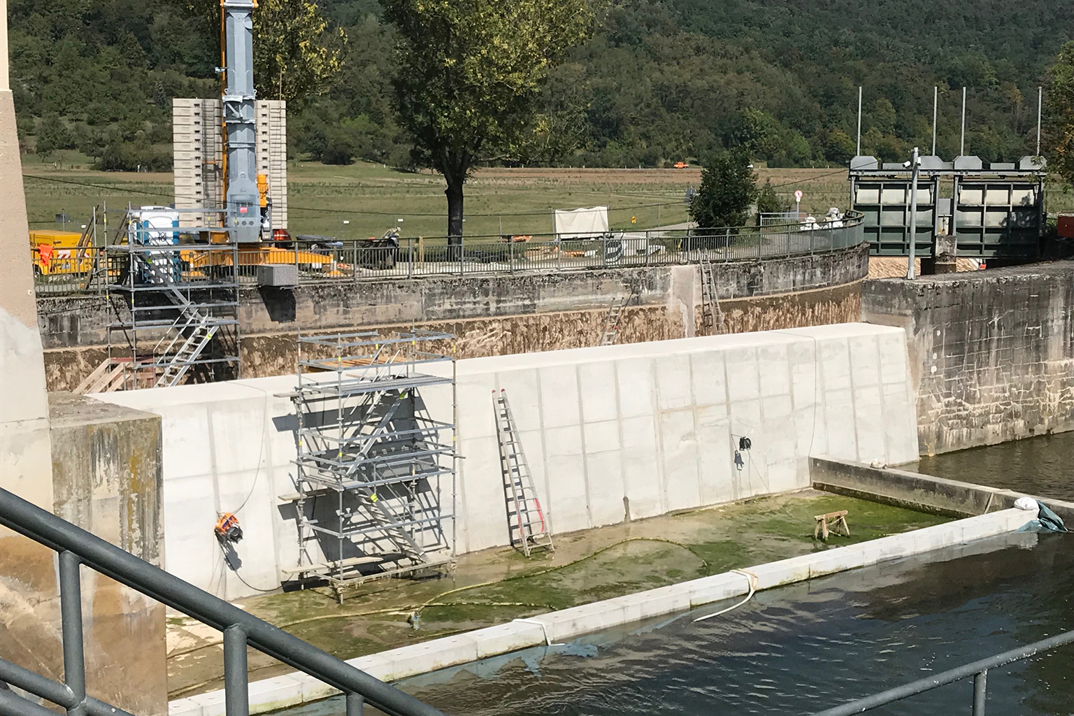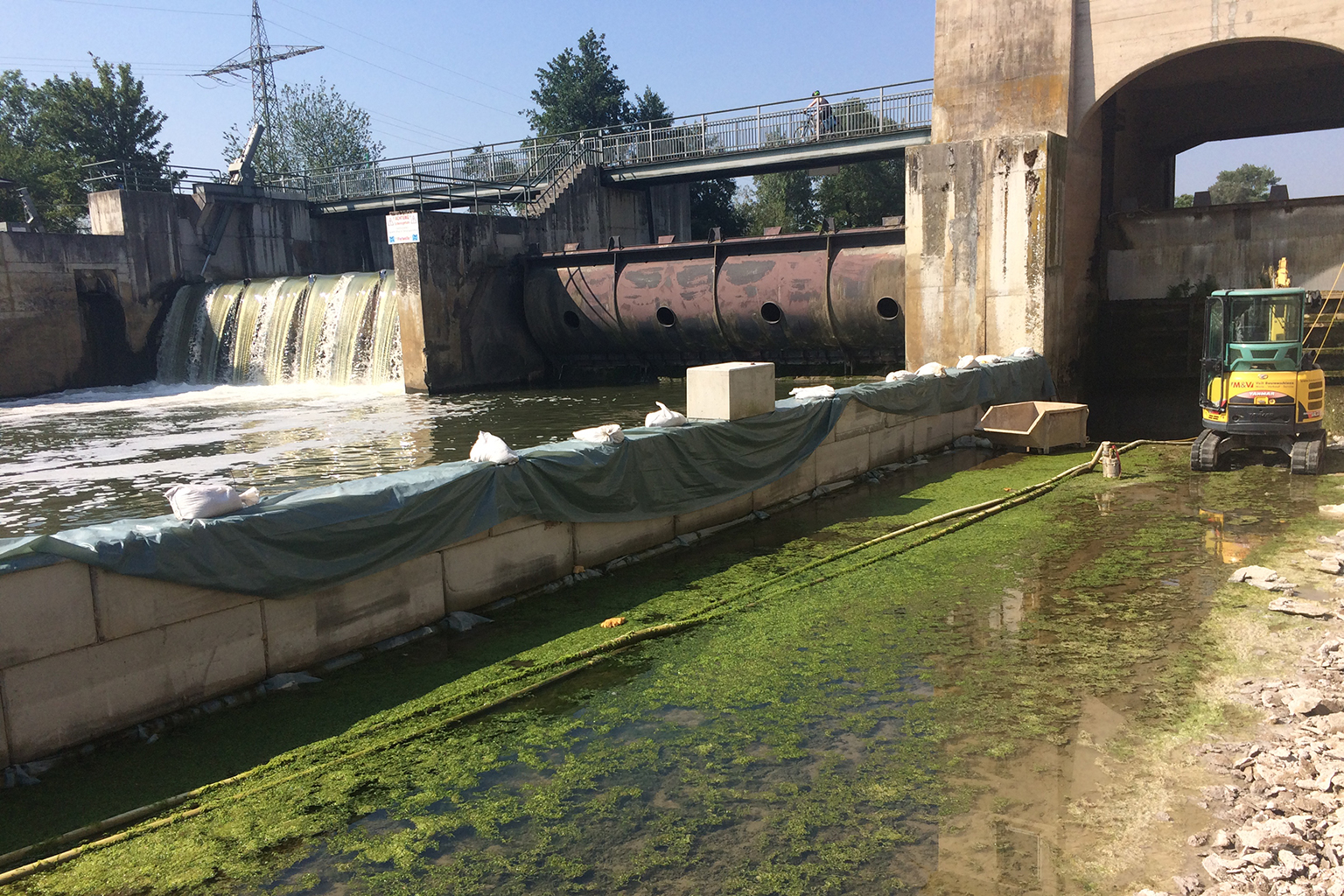 Am Ausleitungswehr der Wasserkraftanlage wird eine als Überlauf dienende Kanalmauer saniert. Hierzu wurde ein Fangedamm zur Abhaltung des Neckar aufgebaut.