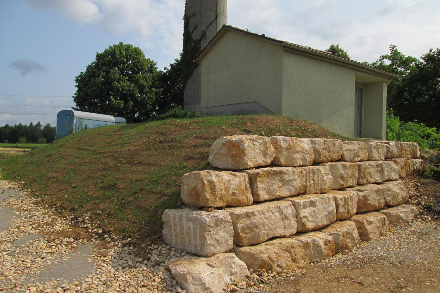 Abbruch der alten Wasserkammer, Baujahr ca. 1890 aus Stampfbeton, Übergang von Betriebsgebäude in neuen Trinkwasserbehälter aus Beton als Durchgang errichtet. Baugrube und PE-Behälter angefüllt, Trockenbaumauer aus Muschelkalkblöcken errichtet.