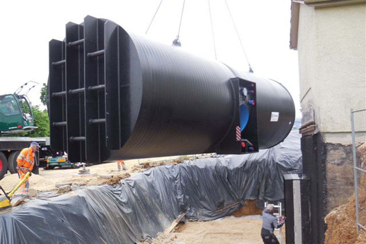 Anlieferung PE-Trinkwasserspeicher per Tieflader an einem Stk.
