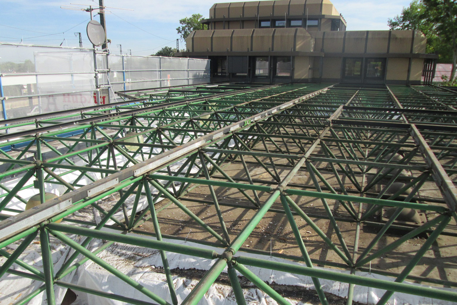 Das zu sanierende Bahnhofsvorplatzdach besteht aus einem Stahlrohr–Baukastensystem aus Kugelknoten, Fachwerkstäben und Stützen mit einer aufliegenden Dachhaut aus Trapezblech, Dämmung, Bitumenabdichtung, Kiesschicht und Oberlichtern. Die Unterseite ist mit Glasalplatten verkleidet. Aufgabe ist der komplette Rückbau der Dachhaut und die Erneuerung.