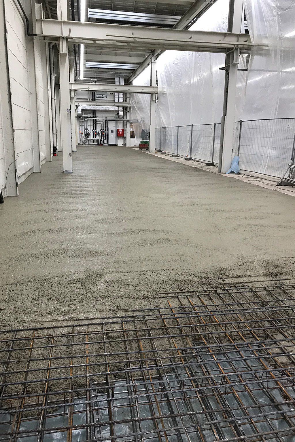 Die ehemalige Bodenplatte wurde mit Mineralbeton (KFT) aufgefüllt, und eine neue Stahlbetonbodenplatte auf Trennlage wurde hergestellt.