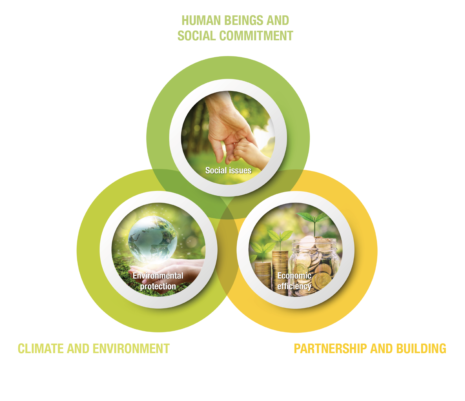 authorities increasingly prescribe a framework of requirements for companies becoming stricter all the time. This large modification process offers opportunities for companies and at the same time bears risks. To recognise them early-on and generate suitable measures is one of our possibilities of positively shaping the future and at the same time continue operating successfully. We consider sustainability an opportunity of living up to our values as a family-owned company and to stand out from our competitors by acting more sustainably. The three pillars of sustainability are our guidelines.