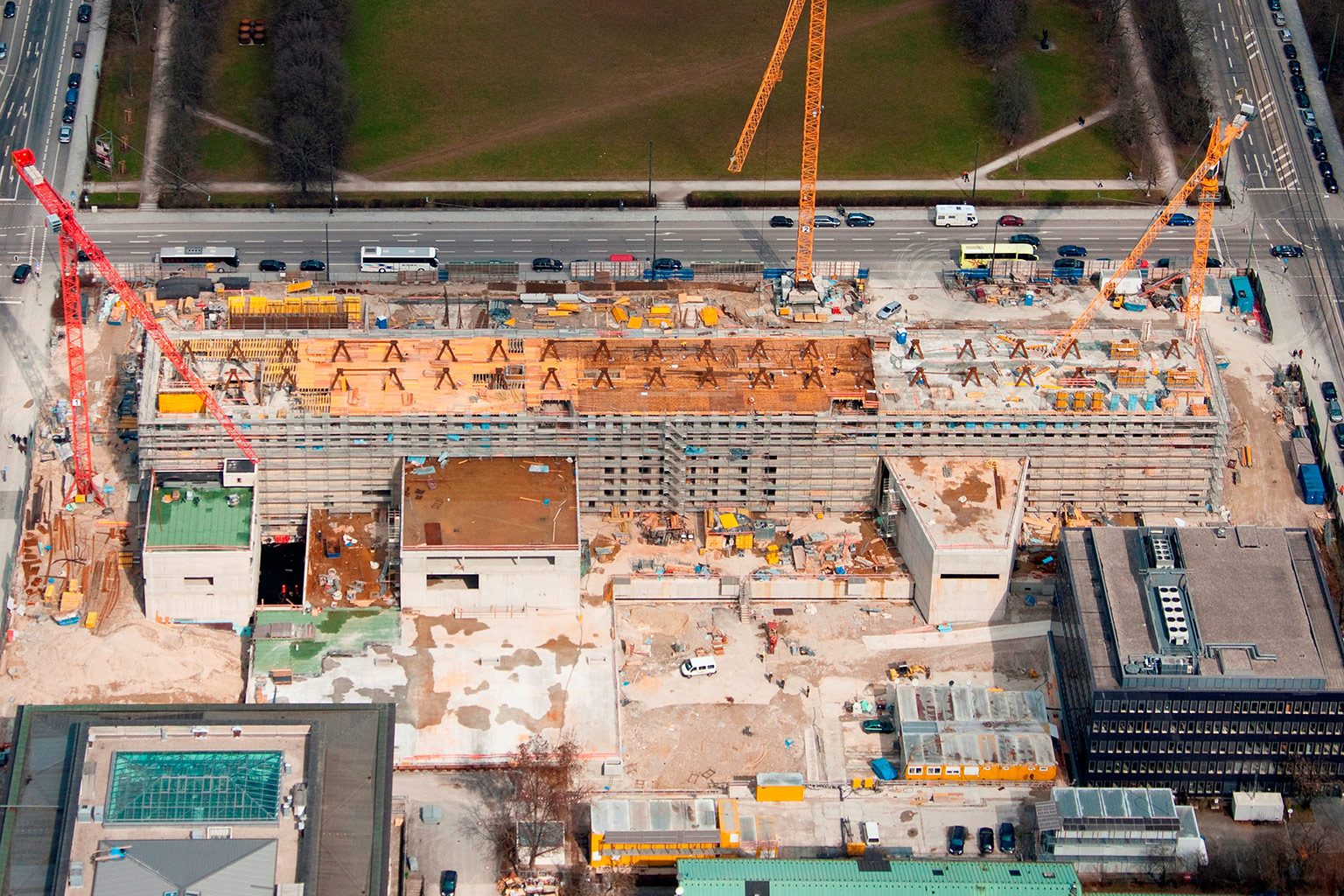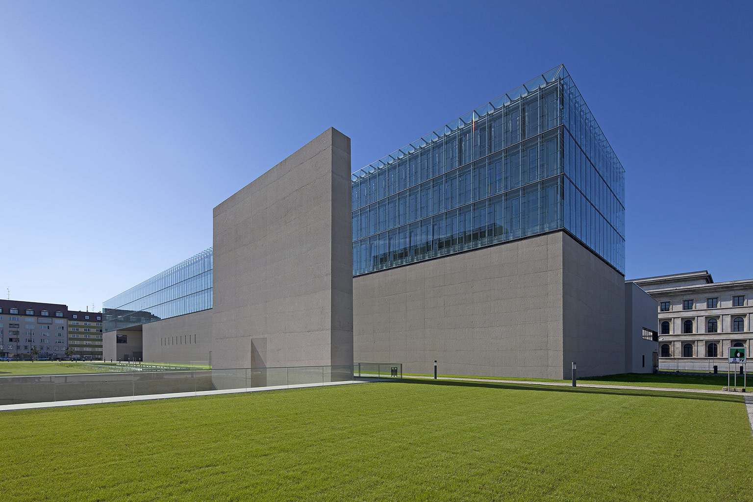 The building measure consists of the new construction of the building part East, made up of the ground floor, two basement floors and 4 upper storeys including a large entry hall, the building parts Centre and West, which are reconstructed to a large extent, the connecting building Belvedere (connecting corridor with a length of 120 m in composite steel construction with the highest requirements of fair-faced concrete) and the protective wall, which consists of a cantilver retaining wall of 160 m of length and 7 m of height including a retention basin.