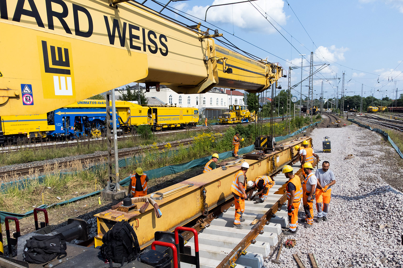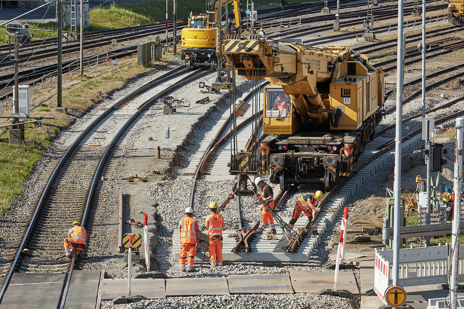 LEONHARD WEISS is your specialist for renewal, maintenance and repair of switches ranging from simple industrial yard switches to complex high-speed switches. We excel in all track types, whether ballasted or slab based. Our modern high-performance cranes enable us to install large prefabricated switch parts of the highest quality without affecting normal railway traffic.