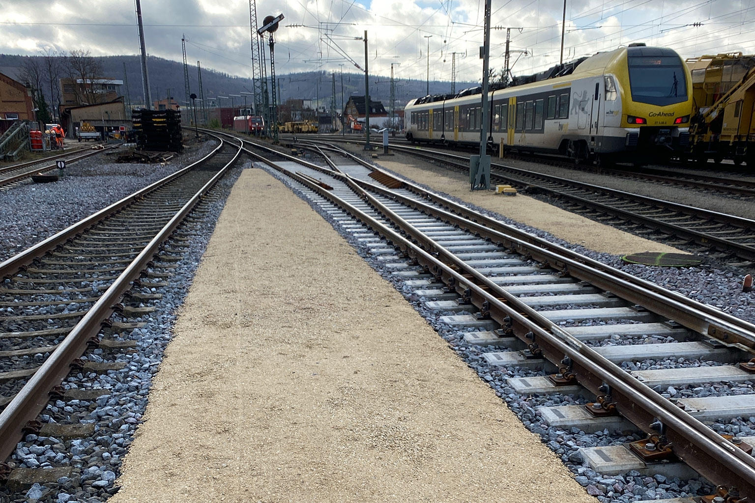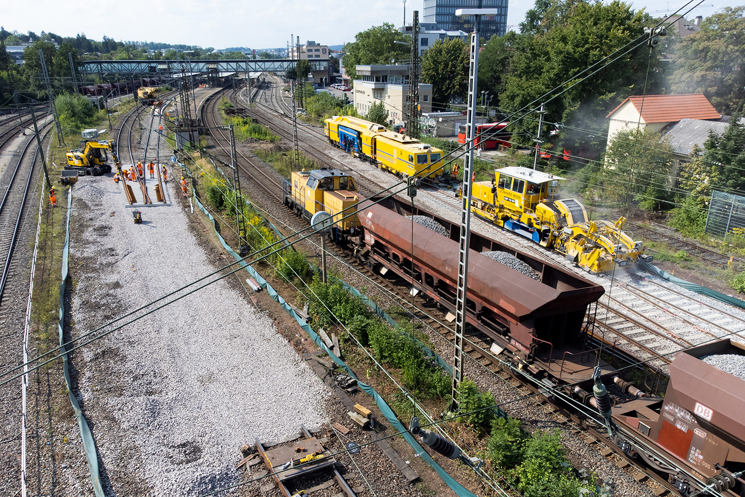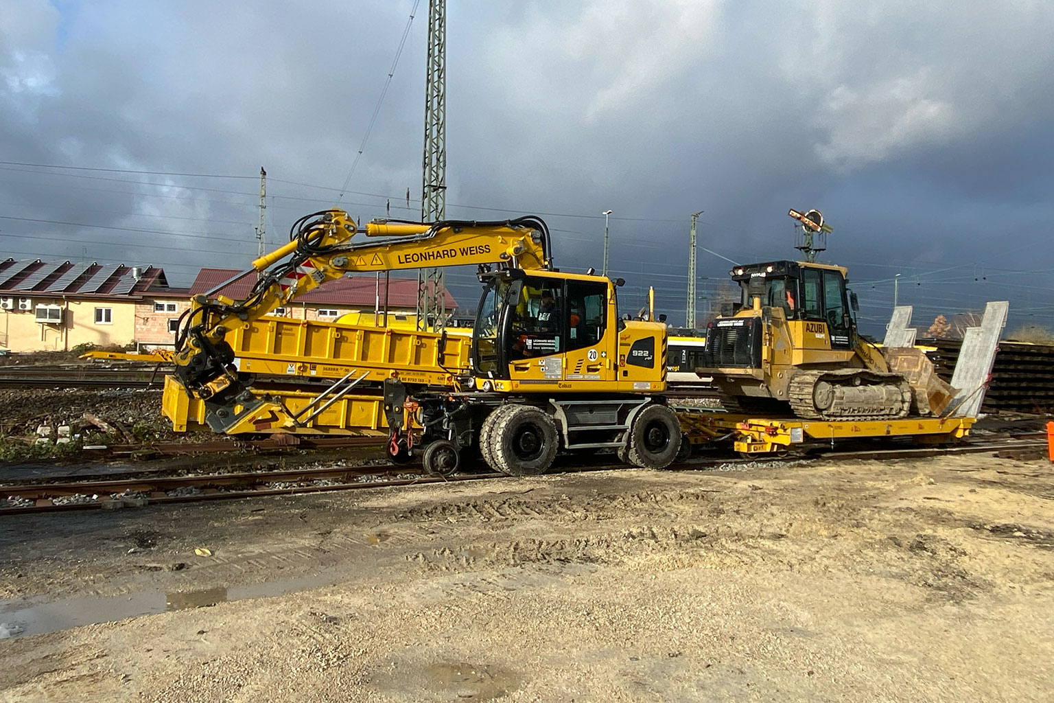 Difficult conditions due to delayed delivery of materials because of supply shortages. In addition to that the GDL strike. Yellow construction site together with the business unit Technik. All “yellow“ large equipment is put to use.Cross-border track conversion