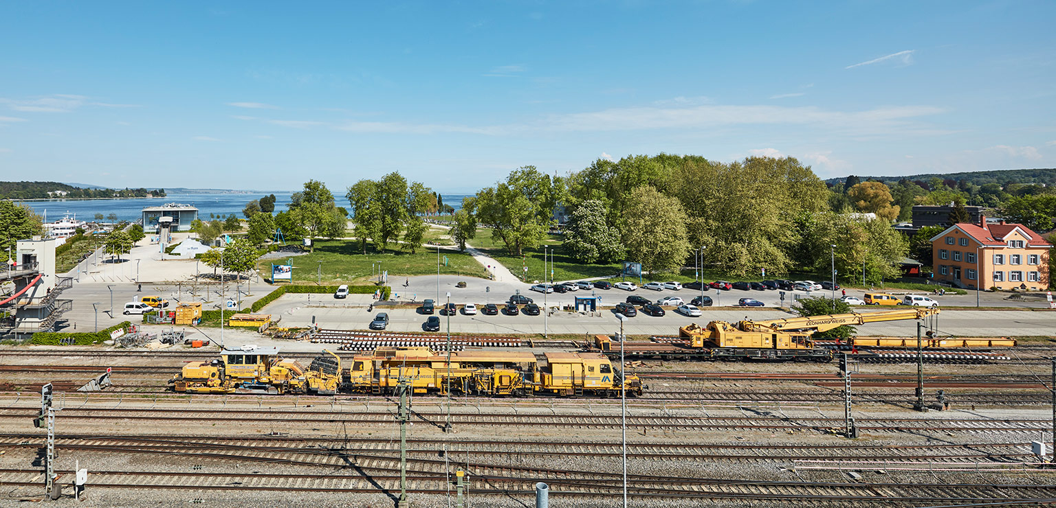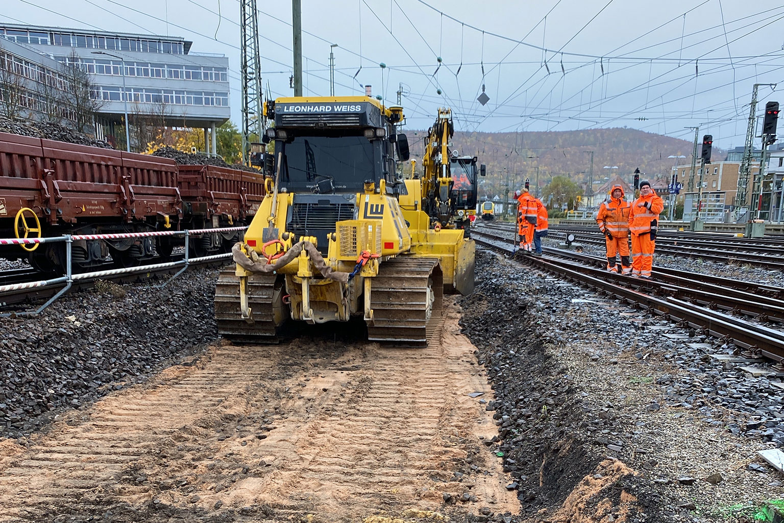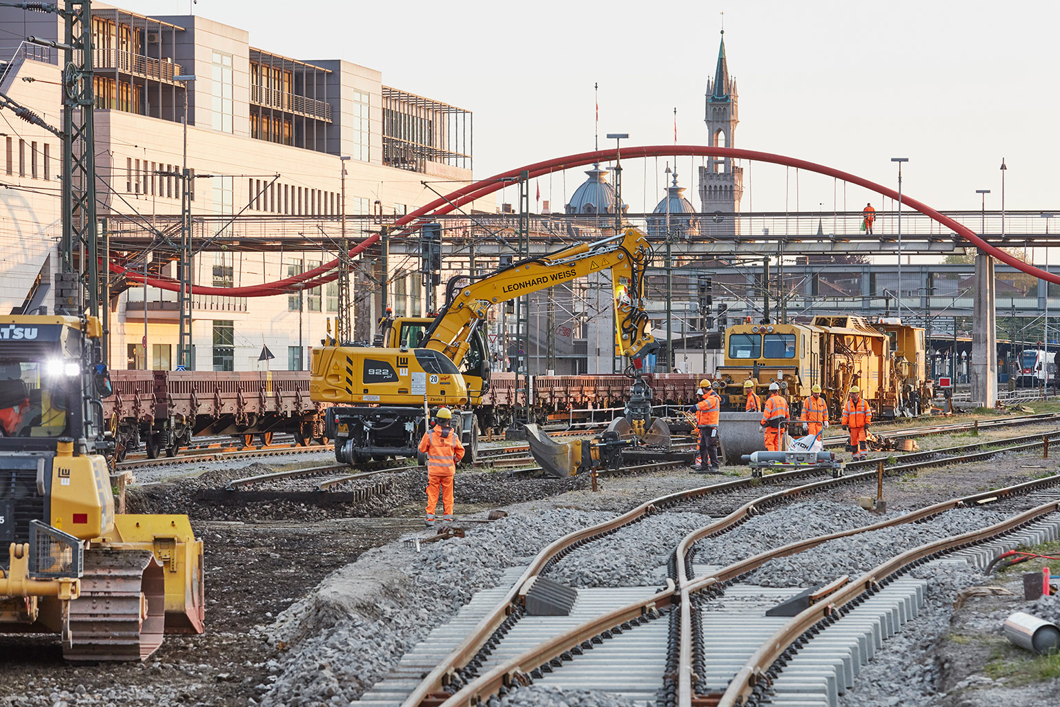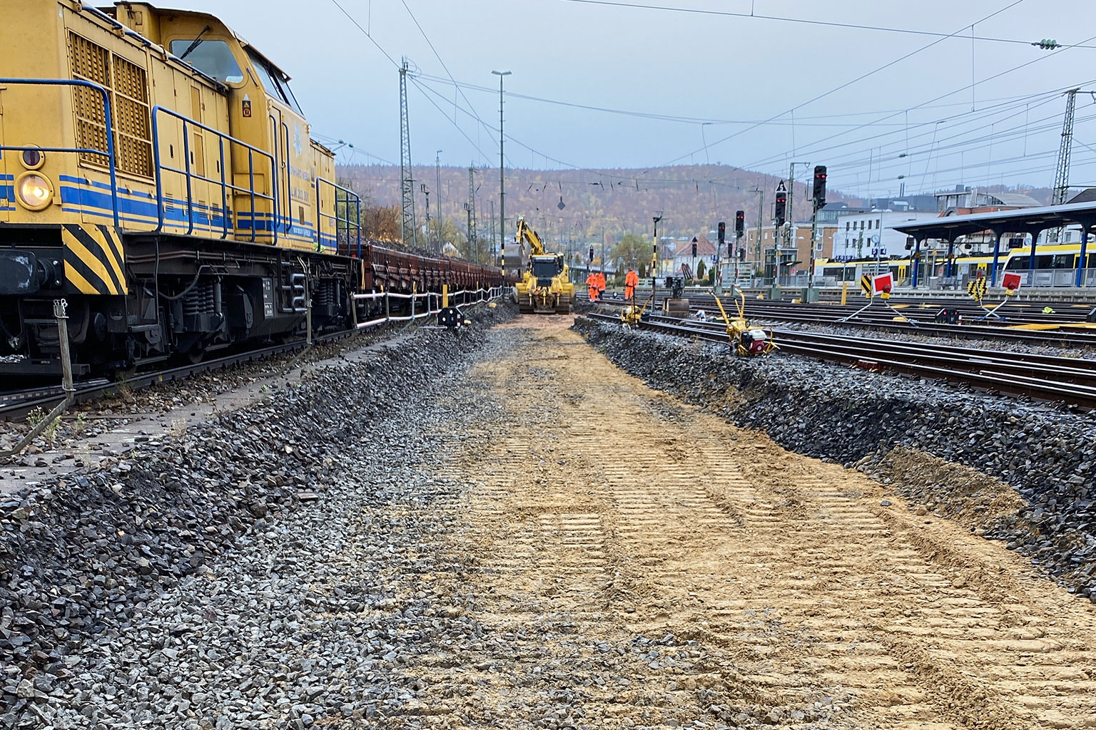 Difficult conditions due to delayed delivery of materials because of supply shortages. In addition to that the GDL strike. Yellow construction site together with the business unit Technik. All “yellow“ large equipment is put to use.Cross-border track conversion